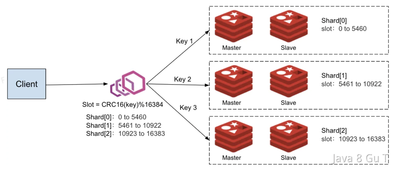 **在Cluster集群模式中,使用哈希槽(hash slot)的方式进行数据分片。**将整个数据集划分为多个槽,每个槽分配给一个节点。